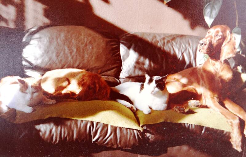 Rechtsboven, Aphrodite als pup in 1979 samen met Cherry op de bank en onze katten.