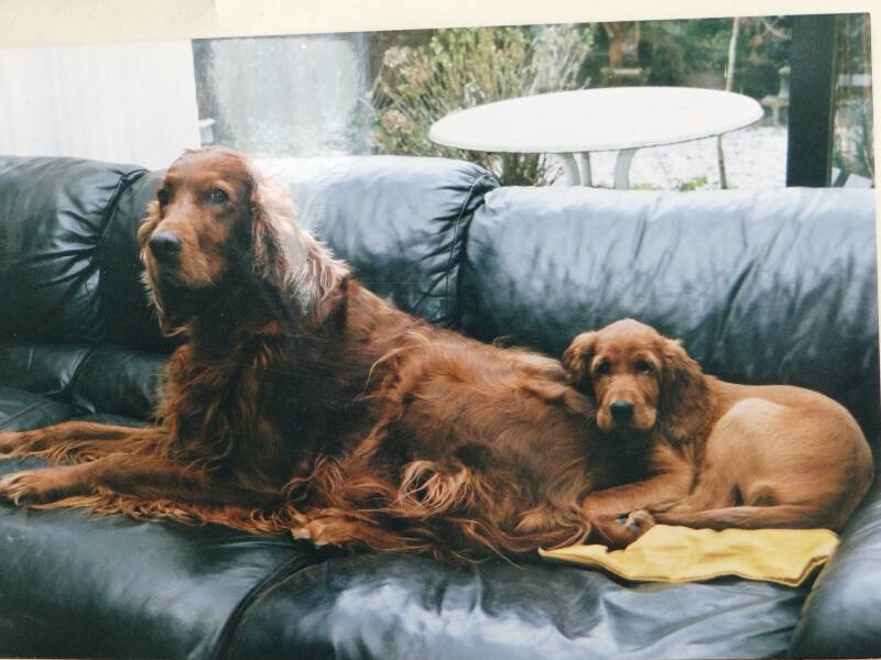 Hierboven Karina Sheba en Daydream als pup op de bank..